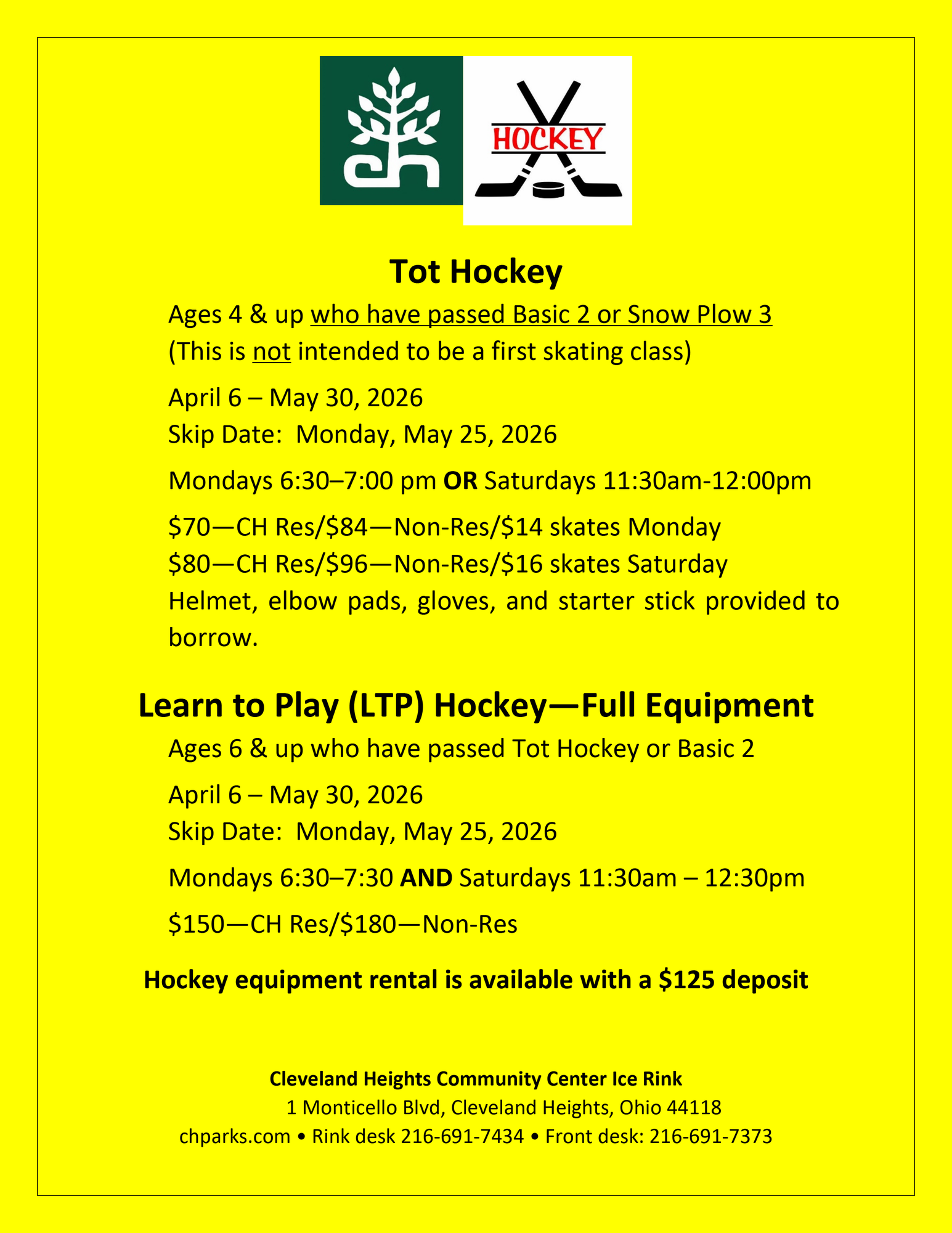 Hockey equipment rental is available with a $125 deposit. Please contact the rink desk at 216-691-7434 to inquire further.